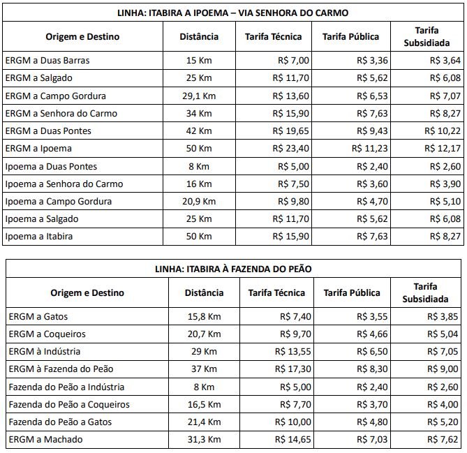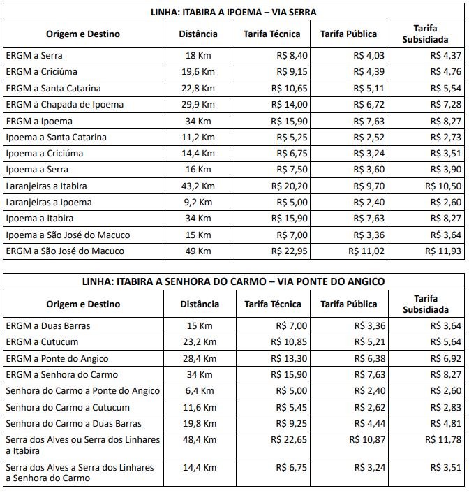 A nova política de preços leva em consideração para quanto a tarifa técnica seria reajustada em cada trecho e estabelece a redução de 52%. O percurso entre a rodoviária de Itabira e a de Ipoema, por exemplo, via Serra, custaria R$ 15,90 na tabela cheia. Com o subsídio, os usuários vão pagar apenas R$ 7,63. Os mesmos valores valem para o percurso entre Itabira e Senhora do Carmo, via Angico.